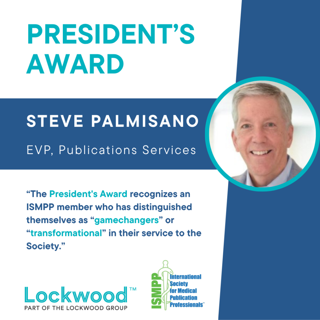 Congratulations are in order for Lockwood’s Steve Palmisano, EVP, Publications Services, on receiving the President’s Award at 21st Annual Meeting of ISMPP (International Society for Medical Publication Professionals)!